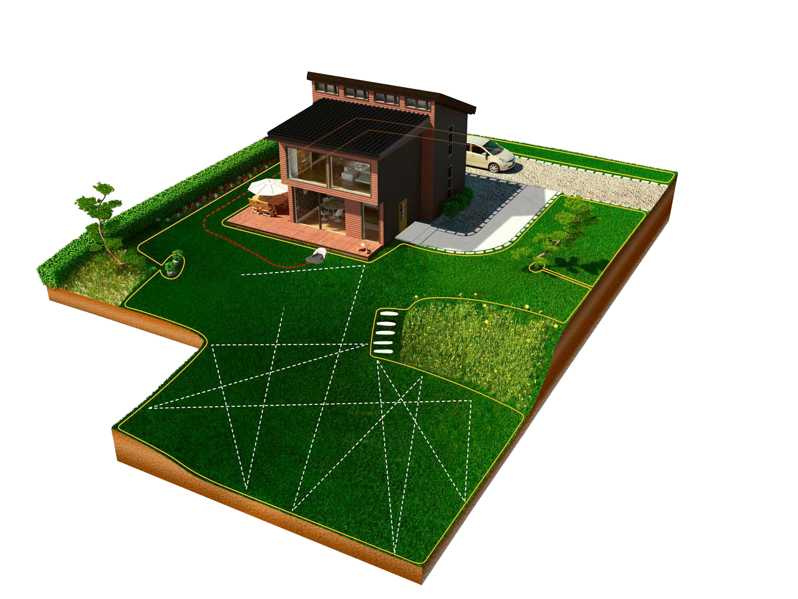 Durch das felxibele Signalkabel können auch komplexe Flächen bearbeitet werden. Bei größeren Flächen sind Mähroboter auch gerne im Team unterwegs. Wir finden ein Lösung für ihren Garten! - STEIGUNGEN MEISTERT ER SPIELEND